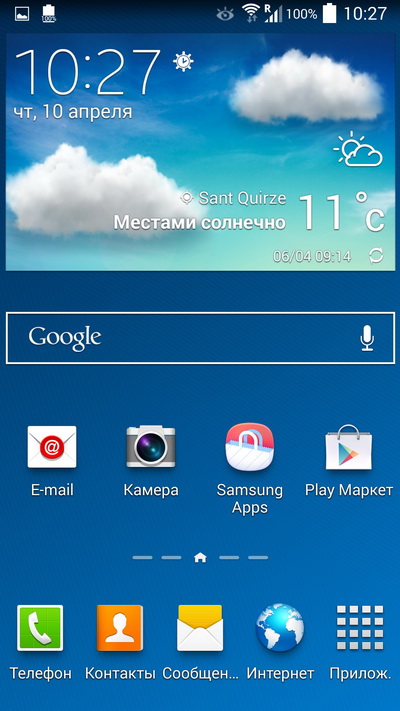 Главный десктоп с фирменным виджетом погоды и даты-времени.