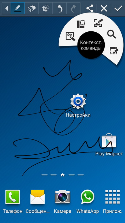 Контекстные команды. Одно из интереснейших нововведений - так называемые контекстные команды, которые связаны с пером S-Pen. Контекстные команды появляются при вытаскивании пера, также их можно вызвать нажатием кнопки на пере. Что там предоставляется?