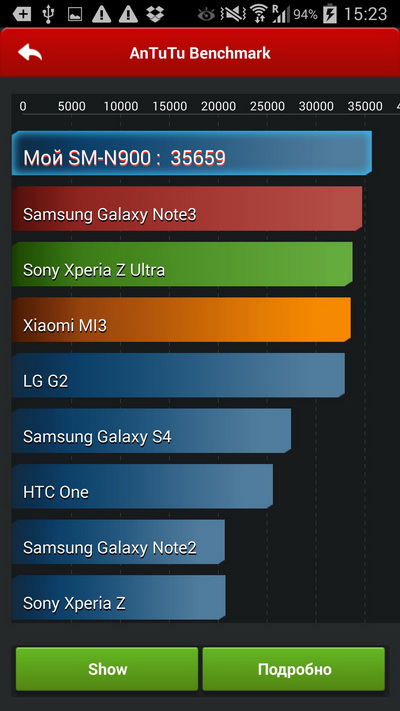 Ну что, начинка у этого аппарата - шикарная. Восьмиядерный процессор, 3 Гб оперативки, Wi-Fi с новейшим протоколом 802.11ac и двумя диапазонами, камера 13 Мпикс, мощный съемный аккумулятор, поддержка карт памяти. Красота! Не хватает только поддержки сетей LTE: кстати, она есть у Galaxy Note 3, но у другой модели (N9005) - на системе Qualcomm Snapdragon 800.
