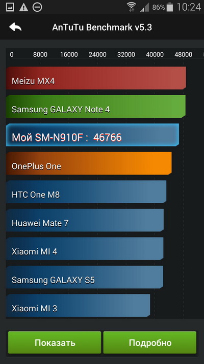 Дисплей у Note 4 - один из самых совершенных на сегодняшний день, если не самый совершенный. Разрешение 2560 x 1440 (Quad HD) дает потрясающую плотность пикселов (515 на дюйм), и это закономерно приводит к тому, что качество изображения и шрифтов - совершенно изумительное. И если раньше у экспертов были претензии к самсунговским матрицам, созданным по технологии PenTile RGB (если кратко - зеленых субпикселов тут в два раза больше, чем красных и синих, то есть это RGBG, а не RGB), потому что в сравнении с "честными" матрицами на RGB у них было хуже качество изображения, то тут даже не понятно, к чему можно придраться, - информация на дисплее выглядит просто прекрасно.
