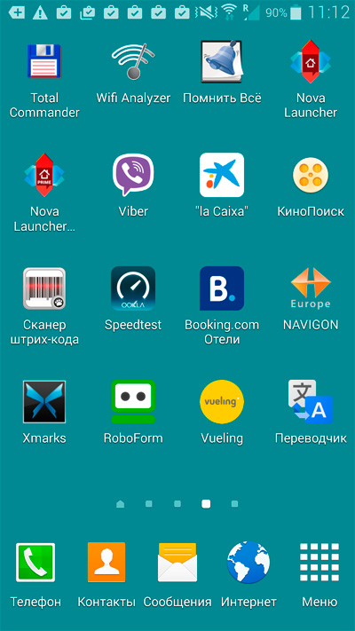 Впрочем, это же Android, так что все в наших руках. Когда я понял, что меня такая сетка раздражает, то просто поставил оболочку Nova Launcher и сделал там ту сетку, которая мне была нужна. (Это не окончательный вид, просто первая прикидка.) Впрочем, там есть одна проблема: список приложений у Nova с точки зрения удобства отбора и сортировки значительно хуже, чем у TouchWiz. Поэтому приходится выбирать - или то, или это.