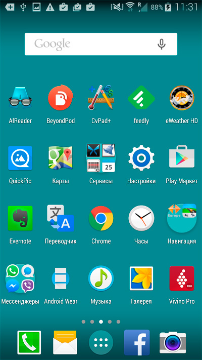 Кстати, обратите внимание на то, какое большое расстояние остается между пиктограммами и по вертикали, и по горизонтали. Здесь реально помещается только 4х4=16 пиктограмм (без нижней постоянной полосы), хотя на таком дисплее запросто помещалось бы 5х5=25 пиктограмм. (Как, собственно, и сделано в Huawei Ascend Mate 7.) И эта проблема в данной оболочке никак не решается: сетку десктопов изменить нельзя, хотя, казалось бы, какая проблема дать такую возможность?