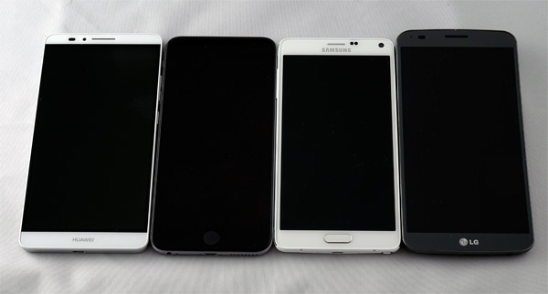 Вот наш герой в компании одноклассников: Huawei Ascend Mate 7, iPhone 6 Plus и LG G Flex.