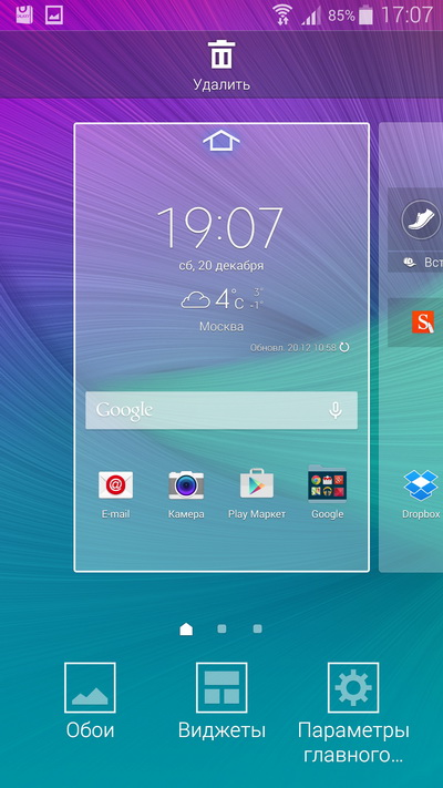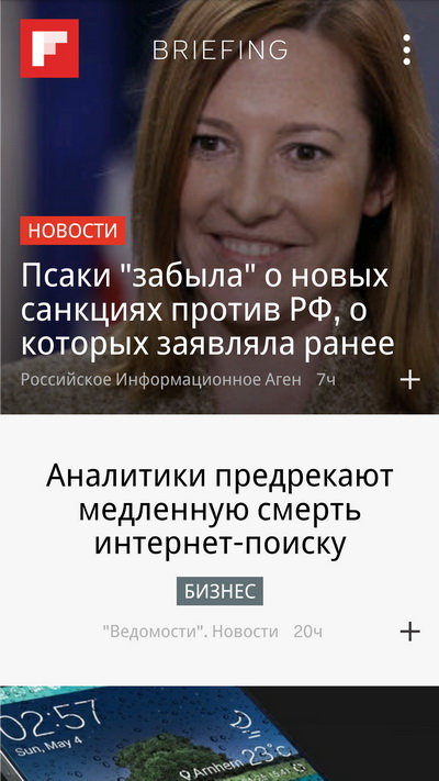 Впрочем, вернемся к TouchWiz. Слева от домашнего экрана в TouchWiz располагается десктоп с обзором новостей программы-агрегатора Briefing-Flipboard. Лично мне этот десктоп в упор не нужен, но он спокойно отключается в настройках десктопа.