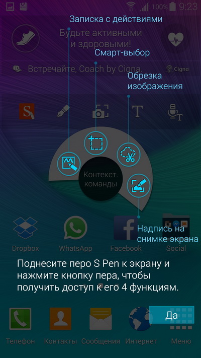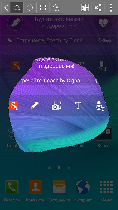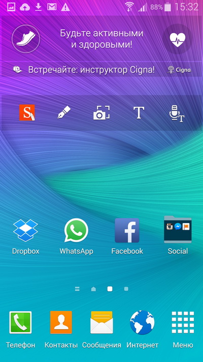 Второй десктоп: виджет программы S Health и виджет возможностей работы с пером - создание заметок и рисунков, рисование по десктопу, снятие скриншотов произвольной формы и так далее.