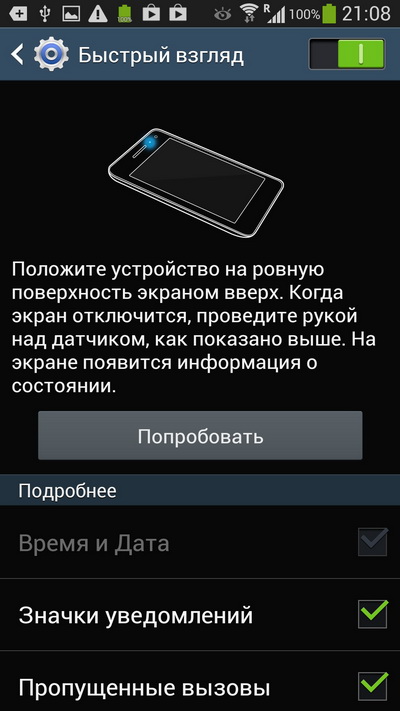 А Вам пришел телефон без фирменного чехла - книжки? Там просто отдельная и прикольная фича. В чехле прорезь, что бы показывать часть экрана. И если телефон знает про этот чехол, то там отображаются симпатичные часики и нотификации. Не нужно раскрывать телефон. При взгляде он активирует эту область ^__^