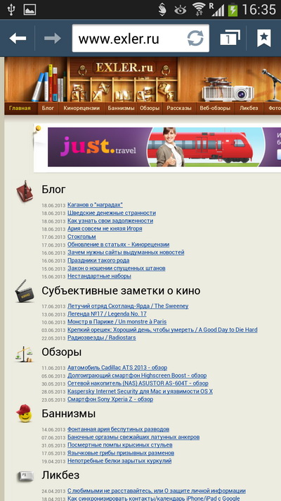 Браузер. С таким разрешением на экране браузера помещается довольно много, но, например, свой же Exler.ru без увеличения на S 4 я читать не могу, а на Sony Xperia Z буквы того же сайта различаются лучше.
