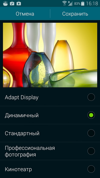 С "кислотностью" цветов Super AMOLED компания также давно справилась: даже в динамическом режиме дисплея цвета насыщенные, но не кислотные, ну и в любом случае вы можете выбирать один из пяти режимов, среди которых присутствует адаптивный - это когда дисплей сам подстраивает характеристики яркости, цветности и контраста под окружающие условия, экономя таким образом использование аккумулятора.