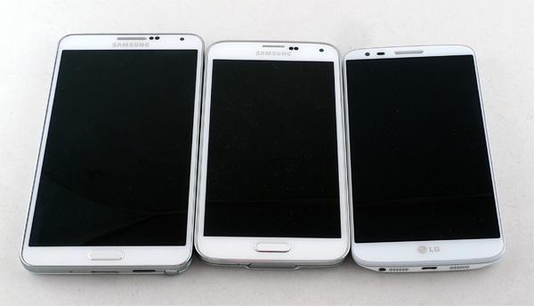 Ну и вот S5 рядом с Galaxy Note 3 и LG G2.
