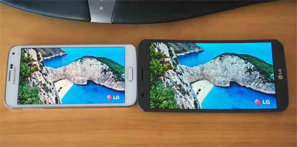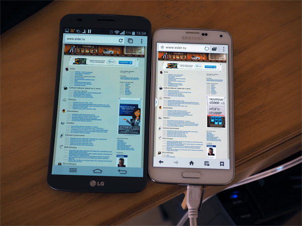 Сравнил дисплей с LG Flex. (Note 3 у меня под рукой нет.) По четкости, оттенкам и углам обзора Galaxy S5, безусловно, выигрывает по всем статьям. (Фото кликабельны.)