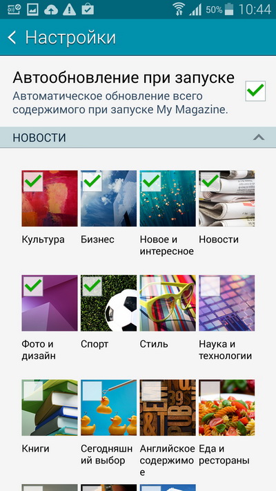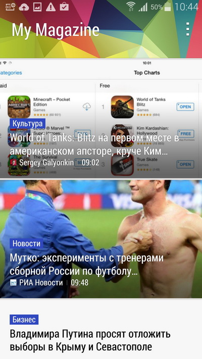 Слева от основного десктопа - приложение "Мой журнал", в котором можно просматривать новости по различным категориям. (Отключить его можно через "Диспетчер приложений" или через настройки десктопа.)