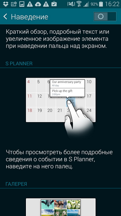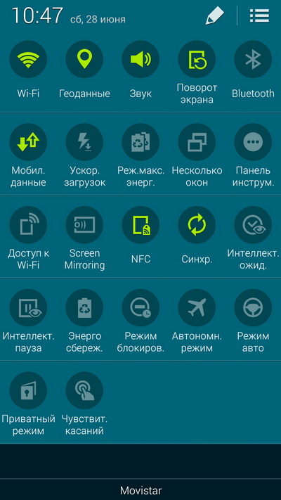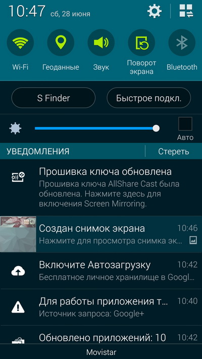 Область уведомлений. Здесь добавились кнопки вызова поиска S Finder и кнопка для быстрого подключения смартфона к совместимым устройствам (телевизоры Samsung, другие смартфоны и планшеты Samsung).