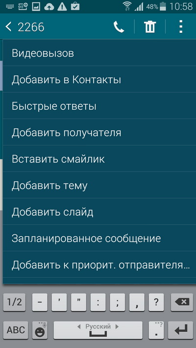 Меню контакта в сообщениях. Для SMS можно задавать приоритетные контакты (для быстрого доступа), также есть список спам-номеров, куда можно заносить соответствующих негодяев.
