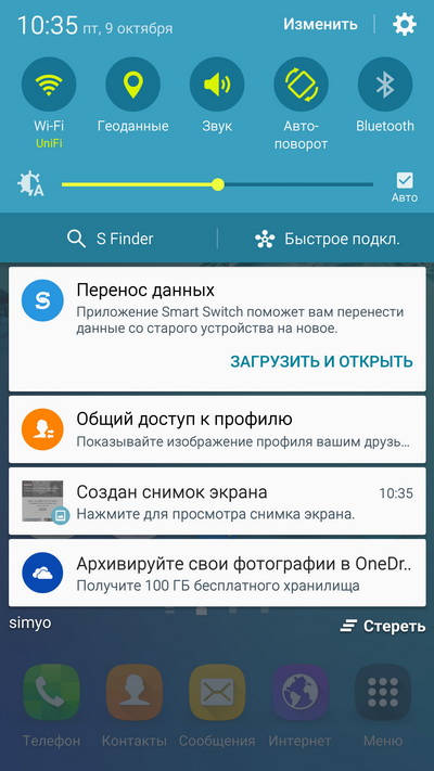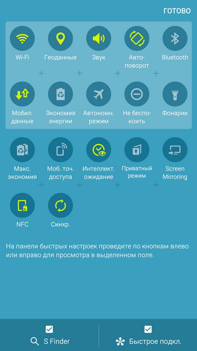 Удобная область уведомлений: сверху скроллируемая строка с быстрыми переключателями, под ними настройка яркости, поиск S Finder и быстрое подключение к другим устройствам.
