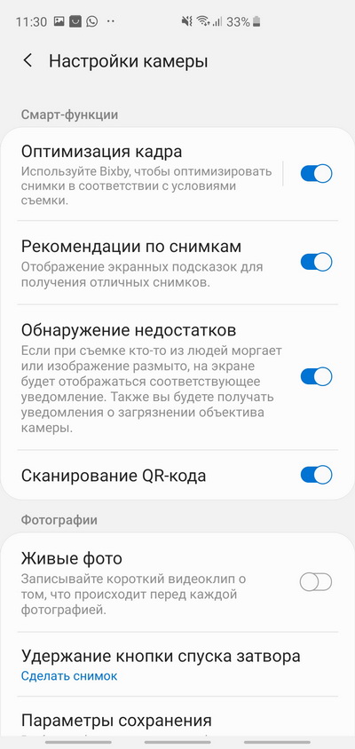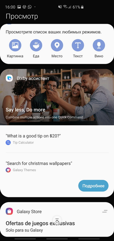 Камера Bixby. Пытается определить объекты и найти им соответствие в Интернете. Для продуктов выводит их состав и калорийность. Потестировал, все это работает довольно криво.
