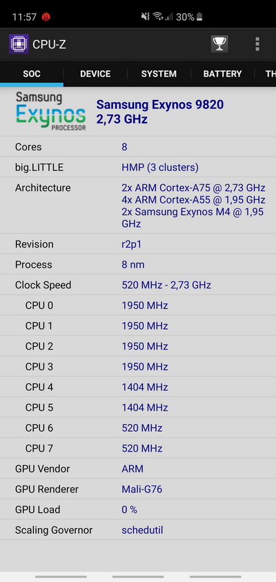 Процессор: Exynos 9820 (2 × 2,3 ГГц Mongoose M4 + 2 × 2,31 ГГц Cortex A75 + 4 × 1,95 ГГц Cortex A55)