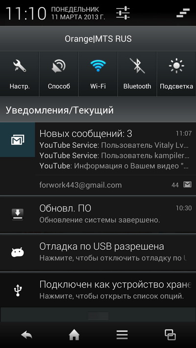 Верхняя панель скроллируется вправо, там хороший набор переключателей: настройки аппарата (вообще, это дубль верхней пиктограммы), настройки звукового профиля, Wi-Fi, Bluetooth, подсветка (тусклая, средняя, яркая, автомат), GPS, синхронизация, мобильные данные, автоповорот экрана, FM-радио.
