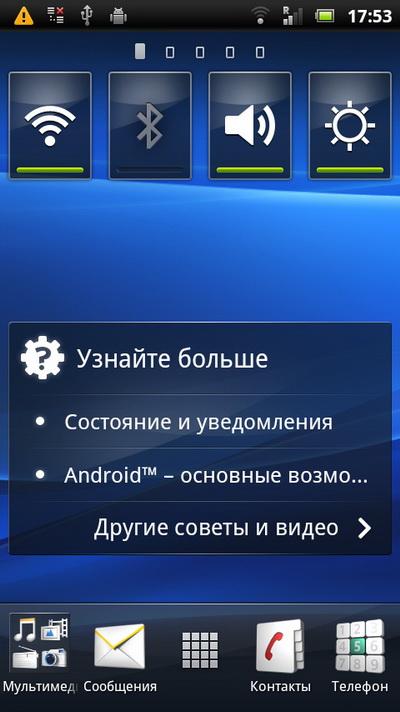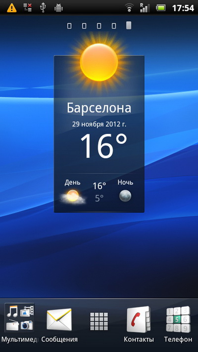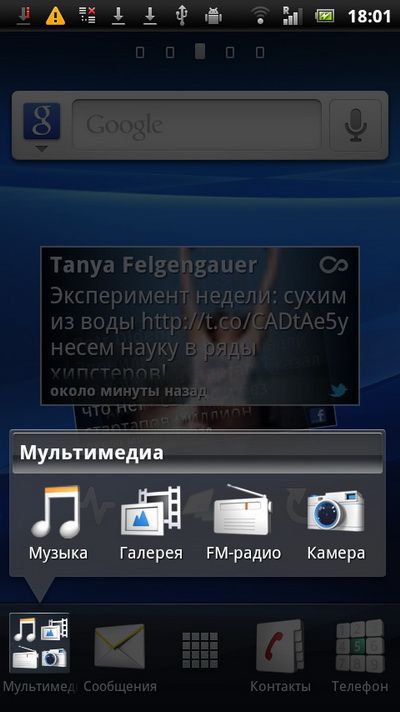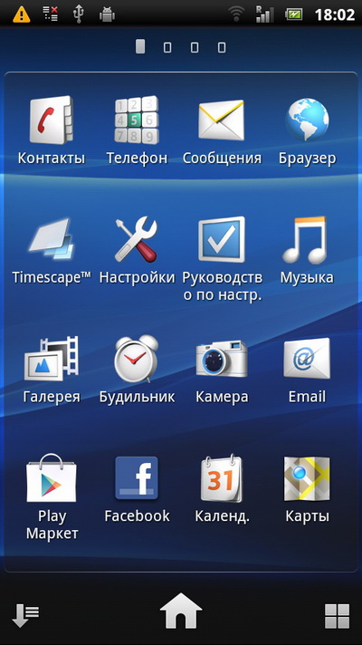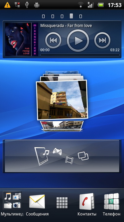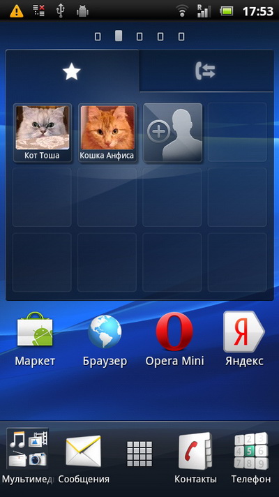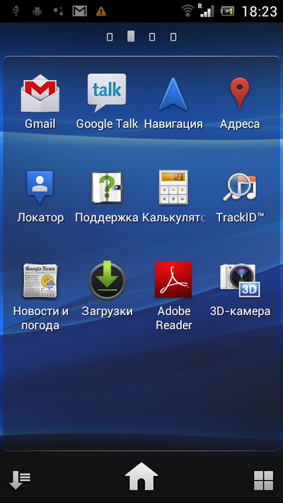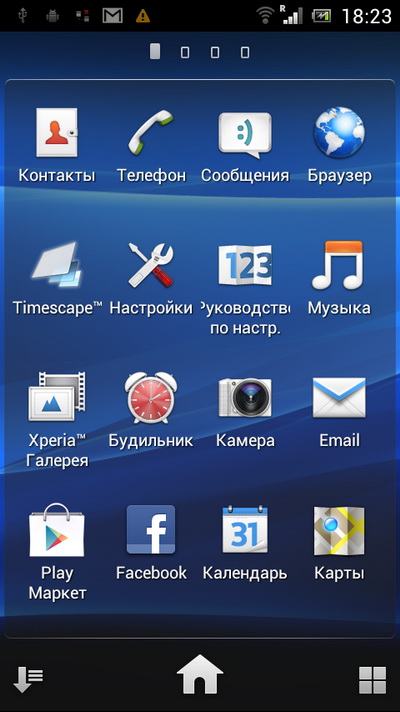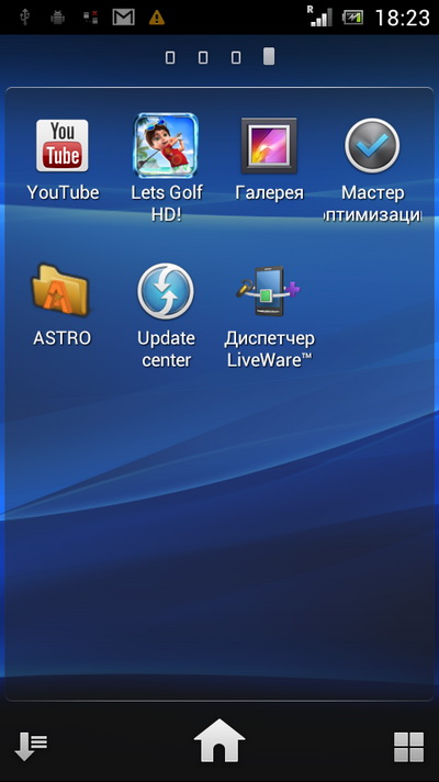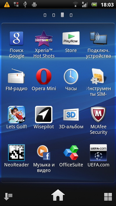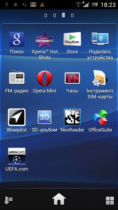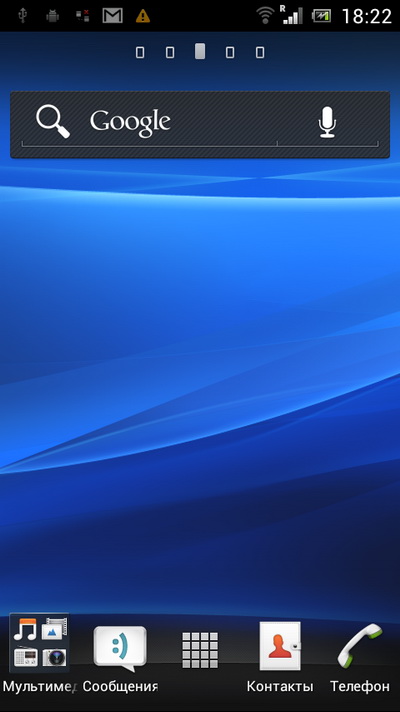 Итак, десктоп загруженного телефона на Android 2.3. Всего пять рабочих столов, скроллируются влево-вправо, но пролистывание не сквозное (а жаль).