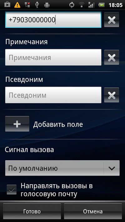 Редактирование контакта. Кстати, здесь есть очень удобная опция "Направлять вызовы в голосовую почту" - больше нигде такой не встречал.