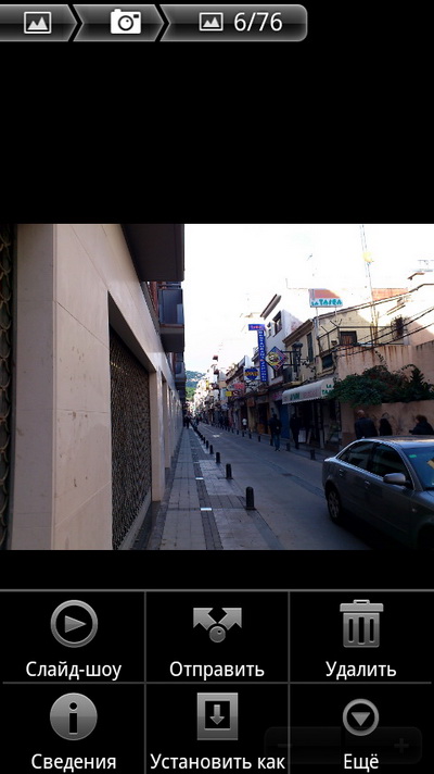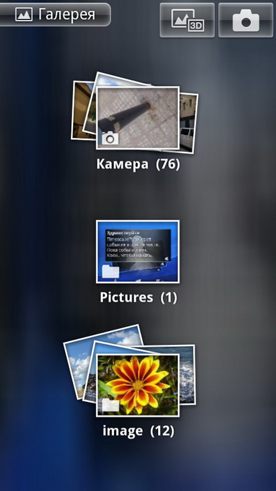 Практически стандартное андроидное приложение. Разве что дополнительно поддерживается специфическая штука - 3D-панорамы, которые умеет делать этот телефон. (О них - позже.)