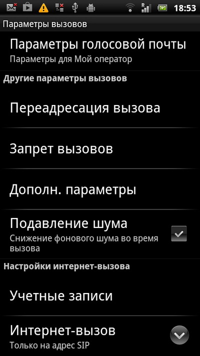 Параметры вызовов. Кстати, тут есть встроенный клиент SIP, так что если завести учетную запись в любом сервисе IP-телефонии на этом протоколе, то можно звонить через Интернет прямо из обычного телефонного приложения. Это удобно.