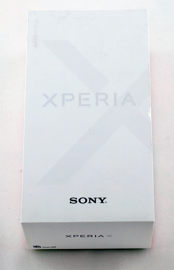 Упаковка - строгая белая коробочка с яркой надписью Sony и еле заметной надписью Xperia X.