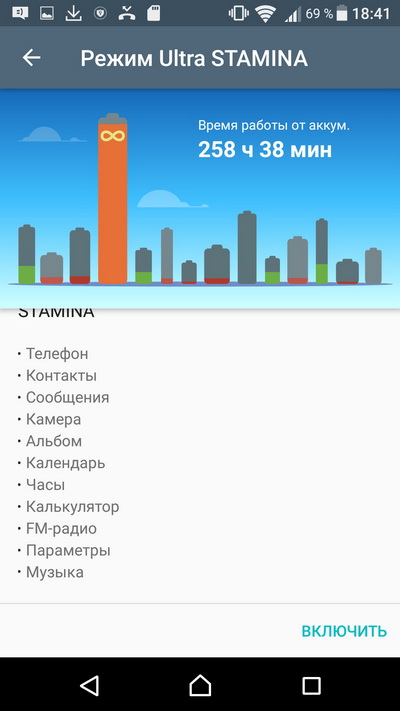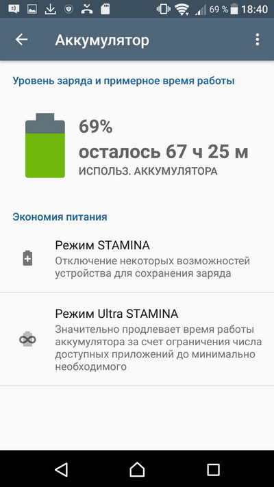 Здесь два режима энергосбережения: фирменная STAMINA, которая действительно заметно увеличивает время автономной работы, и сверхсберегающий режим Ultra STAMINA.