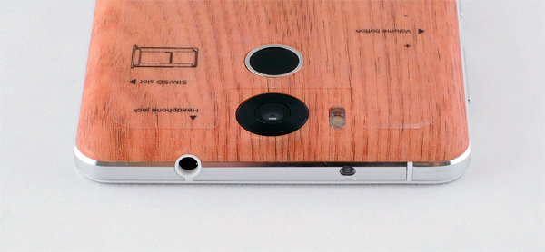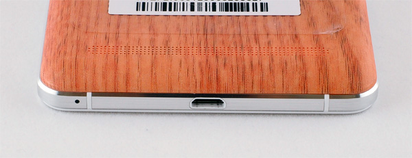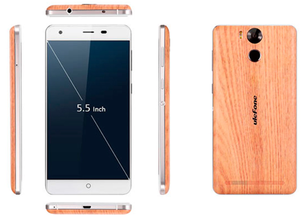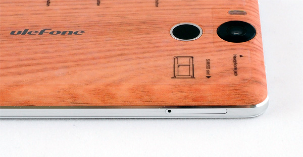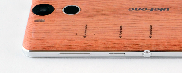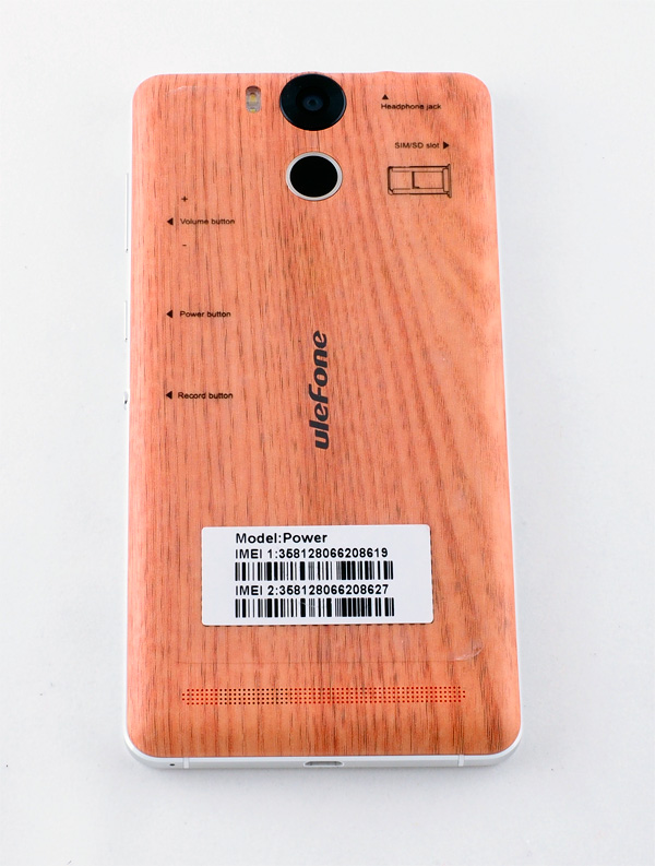 Задняя часть смартфона, судя по всему, сделана из натурального дерева. Я был уверен, что это просто пластик "под дерево", однако похоже, что это именно дерево. В руке такая оригинальная задняя крышка лежит очень хорошо: деревянная поверхность слегка шероховатая и в ладони не скользит. Ну и напомню также, что Ulefone Power бывает еще с белой и черной матовой задней крышкой.
