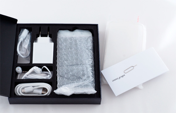 Комплектация совсем не бюджетная: смартфон, кабель USB-microUSB, адаптер питания с европейской вилкой (из китайских магазинов смартфоны часто приходят с китайской вилкой), кабель OTG, проводная гарнитура, защитная пленка-стекло, силиконовый прозрачный чехол, скрепка для вытаскивания слота под сим-карты, брошюрка.