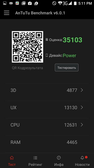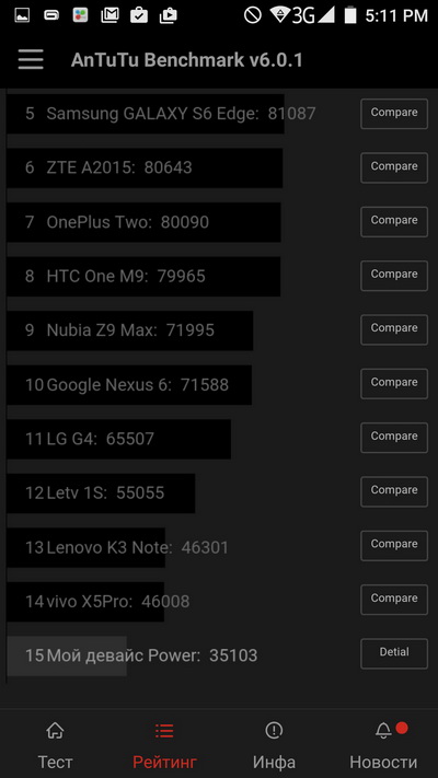 Ну и общий индекс по PCMark. А вот тут Lenovo K3 Note слегка уступает - у него 3079.