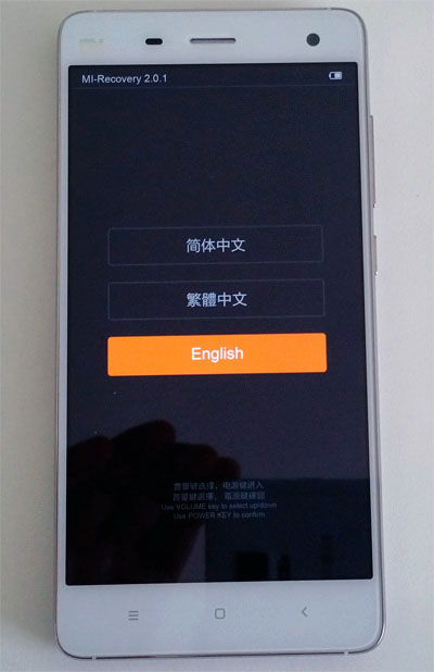 Впрочем, у Xiaomi есть встроенный MI-Recovery: вы можете выключить телефон, затем включить его, удерживая кнопку питания и увеличение громкости, - запустится соответствующая программа. Там выбираете английский язык.
