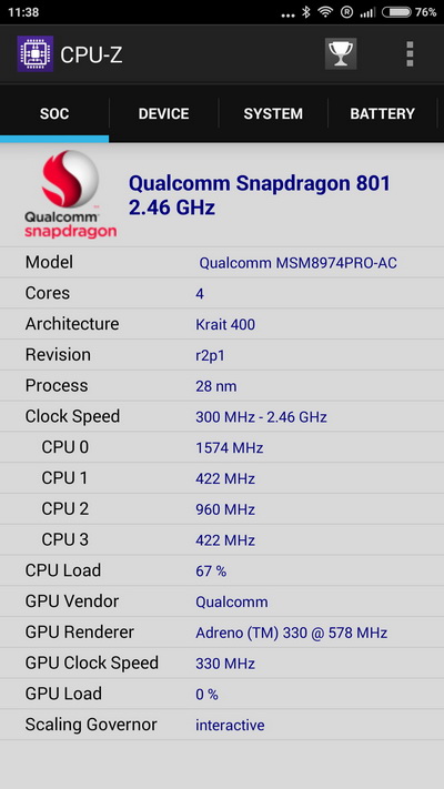 Процессор: Qualcomm Snapdragon 801, 2,5 Ггц, четырехъядерный