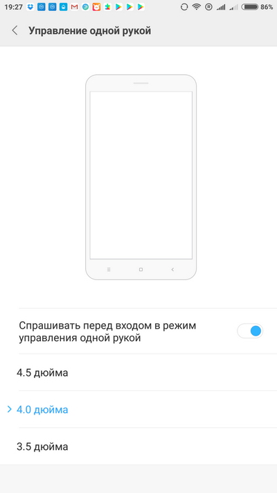 Предусмотрен режим управления одной рукой - со сдвигом экрана.