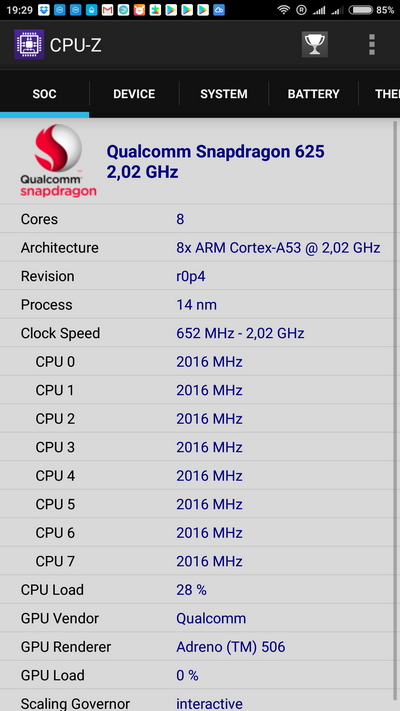 Процессор: Qualcomm Snapdragon 625 (8-ядерный ARM Cortex-A53, частота 2,0 ГГц)