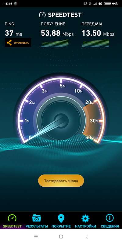 Скорость перекачки по Wi-Fi - почти максимальная, скорость мобильного Интернета была даже выше ожидаемой.