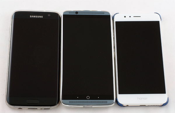 Ну и наш герой рядом с Samsung Galaxy S7 edge и Huawei Honor 8 - все в прозрачных защитных чехлах.