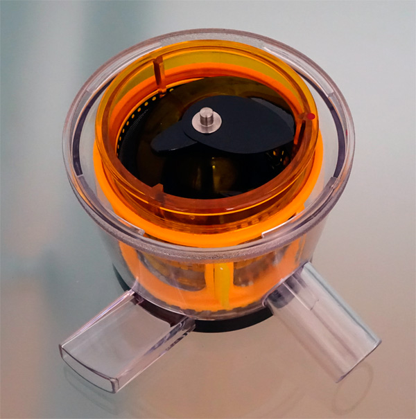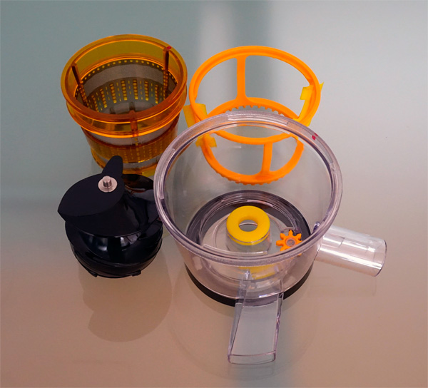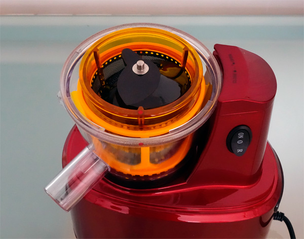Продукты при прохождении через шнек сдавливаются, выделяют сок, который затем оказывается во вращающемся фильтре из нержавеющей стали трапециевидной формы. Здесь, на дне фильтра, нет терки, как в обычных соковыжималках. Сок, проходя через фильтр, под действием центробежной силы подается к носику, откуда вытекает в приготовленную пользователем емкость. Жмых через специальный канал подается к своему носику и удаляется из соковыжималки. На этом процесс отжима завершен.