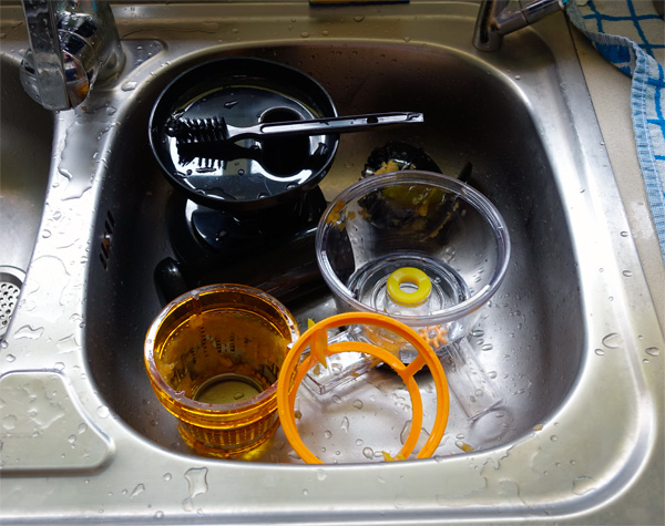 Далее элементы соковыжималки промываются в раковине водой (при необходимости можно воспользоваться прилагаемой щеточкой).