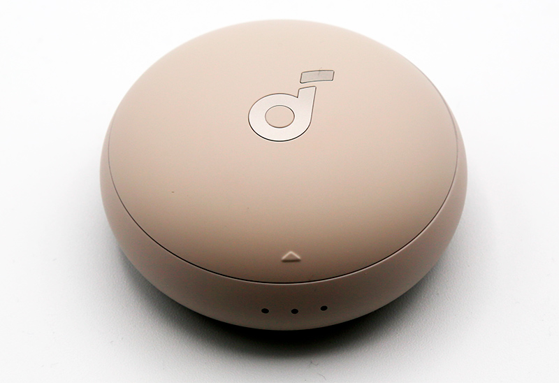 Зарядный кейс. Крышка сдвигается назад. На передней грани кейса расположены три светодиода: два крайних показывают зарядку левого и правого наушника, центральный показывает зарядку самого кейса. Кейс выполнен из матового пластика.