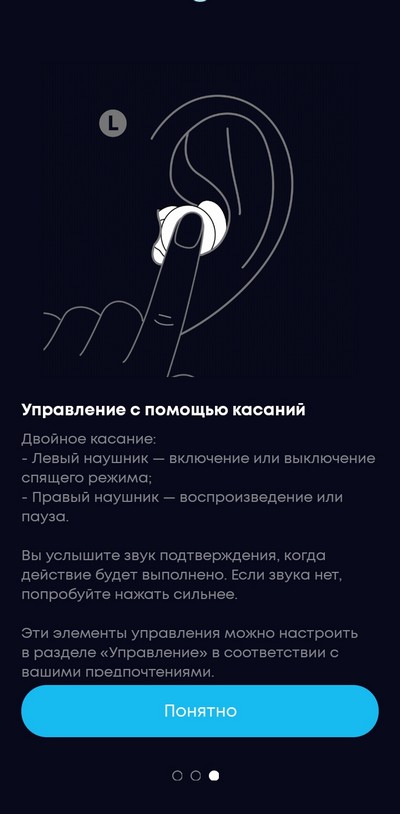 Приложение после установки обнаруживает наушники и предлагает их подключить. После этого дает соответствующие инструкции по использованию наушников.