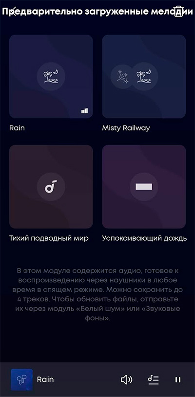 Для этих наушников, конечно же, есть приложение с самыми разнообразными звуками и программами сна, я это ниже покажу, но они также имеют автономный режим работы: в них можно загрузить до четырех композиций и запускать воспроизведение безо всякого смартфона.