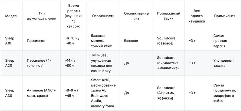 Ну и почти во всех обзорах называют специальные наушники для сна Soundcore Sleep от Anker, причем там есть три модели: Soundcore Sleep A10, Soundcore Sleep A20 и Soundcore Sleep A30. В обзорах чаще всего называют Soundcore Sleep A20.