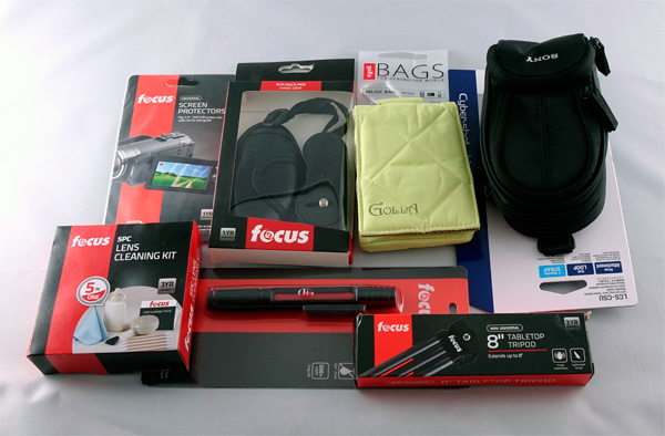 Вот эти прибамбасики: трипод, чехол для камеры, чехол для музыкального плеера, пленка для дисплеев фото- и видеокамер, два комплекта для чистки линз, ручка-стабилизатор камеры. Пустячок, а приятно.