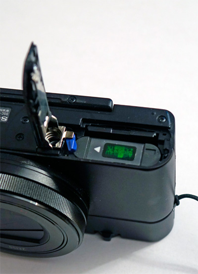 Карта памяти вытаскивается легко и удобно (что далеко не всегда случается с камерами от Sony), а вот крышка этого отсека - точно такая же хлипкая и ненадежная, как и в первой модели. Собственно, у моего RX100 эта крышка (точнее, ее пластиковая насадка) очень быстро сломалась. Хорошо еще, что фотоаппаратом при этом пользоваться можно, потому что остов крышки сделан из металла и даже без пластиковой насадки это все работает.