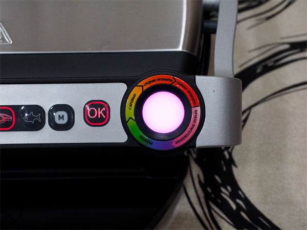 Далее кладете мясо и просто ждете, когда гриль достигнет определенного уровня прожарки. Каждый уровень приготовления он отмечает определенным цветом, и по достижении уровня раздается негромкий звуковой сигнал.
