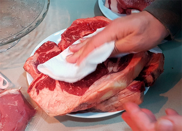 Перед жаркой мясо обязательно нужно промакнуть бумажным полотенцем - убрать лишнюю влагу.