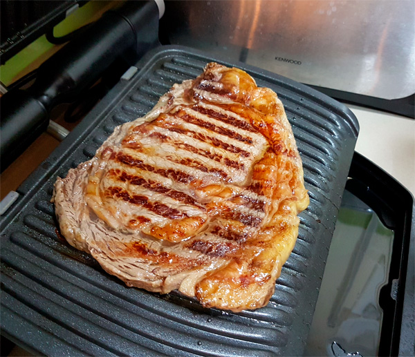 Я, как известно, большой любитель правильных кусочков мяса (разнообразные стейки, антрекоты и прочая мясная прелесть), которые к тому же должны быть правильно приготовлены. Конечно, в домашних условиях стейк можно приготовить на правильной сковороде (это так называемая гриль-сковорода - из толстого чугуна с волнистым дном), но быстрее и удобнее для приготовления стейков и антрекотов использовать двухсторонний электрический гриль. >