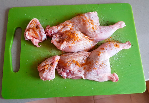Тушка цыпленка, разрезанная пополам (крылья рекомендуется отрезать, чтобы прожаривалось равномерно), посыпанная солью, перцем и карри.