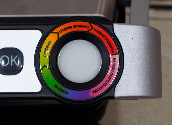 На индикаторе определителя уровня прожарки по умолчанию надписи нанесены на английском. Однако к грилю прикладываются кружочки еще на пяти языках, включая русский, и вы нужный кружочек можете наклеить сверху.