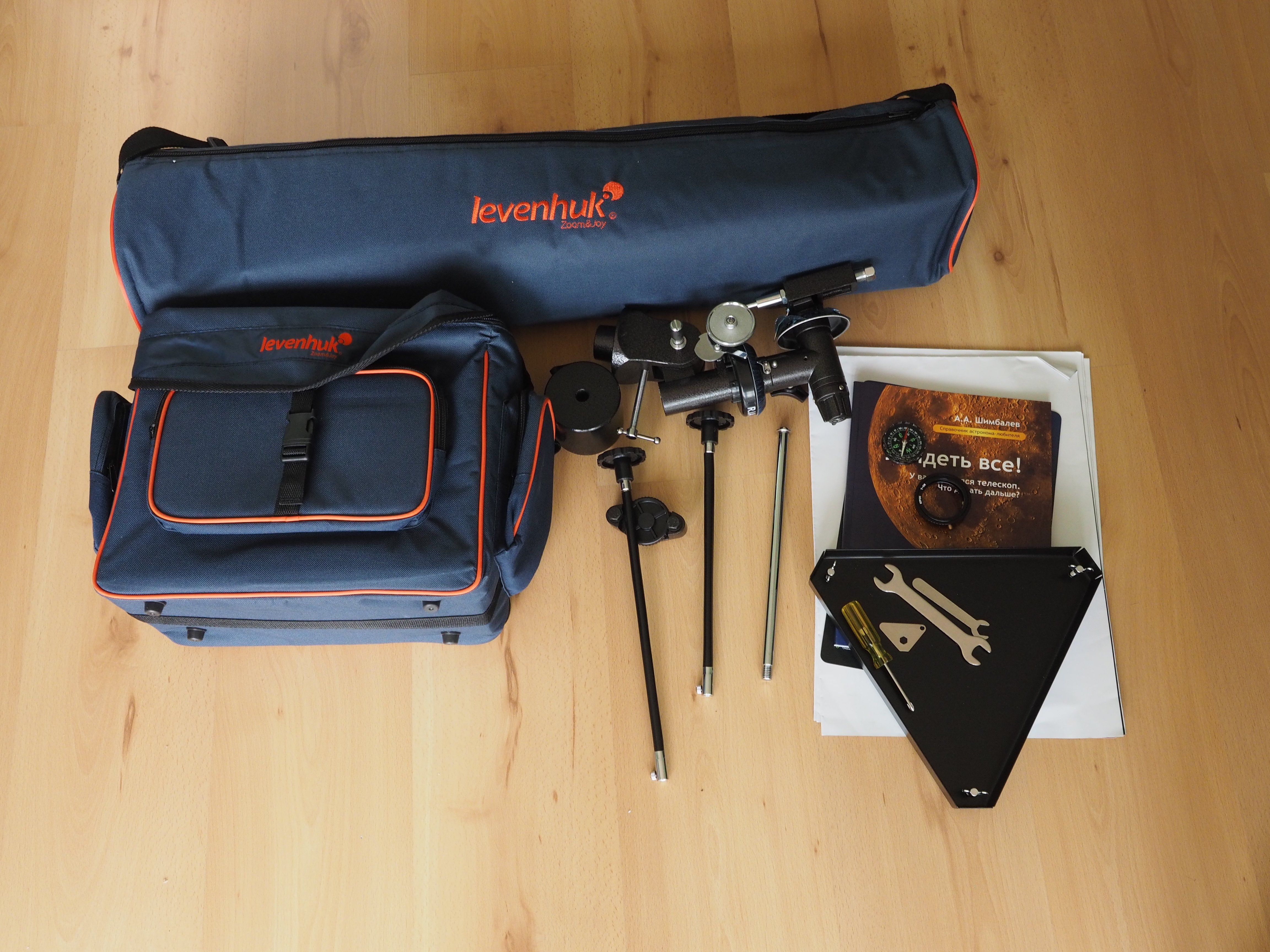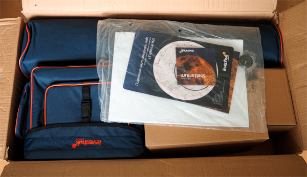 Кстати, по поводу загородных прогулок. Телескоп позиционируется как переносной, для чего тут в комплект входят две сумки. В одну укладывается телескоп с монтировкой, в другую - тренога (только у нее придется отвинтить столик для дополнительных аксессуаров). Все это кладется в автомобиль или несется на плече, а на месте собирается буквально за пару минут - это очень удобно.